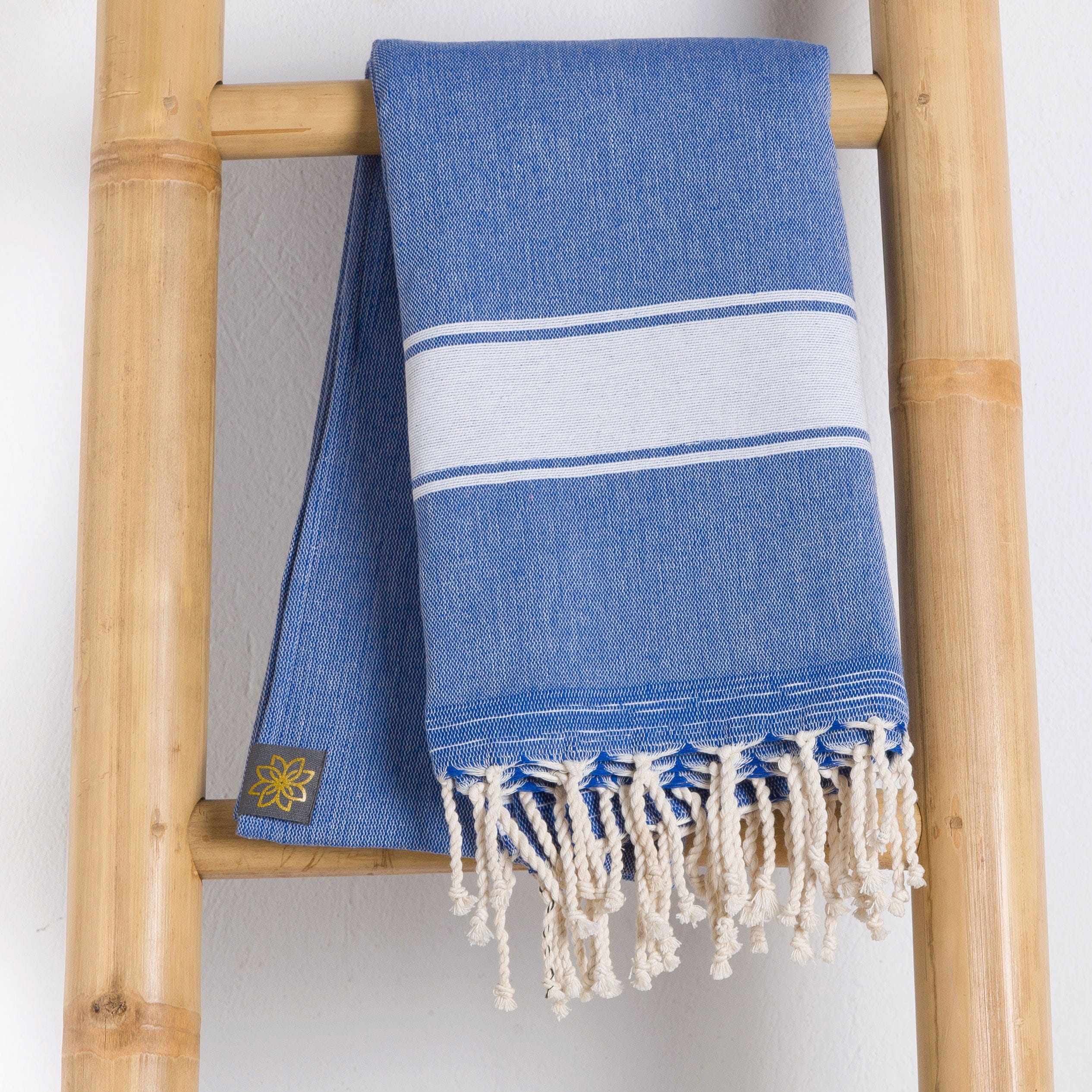 Varje handduk är unik och tillverkas under rättvisa villkor. De handknutna fransarna ger varje exemplar en personlig, hantverksmässig känsla. Genom att använda 100 % återvunnen bomull bidrar varje handduk till ett mer hållbart val. Mitt på handduken hittar du dessutom en invävd badge med jasminblomman - ANNA ANIQs emblem - som gör att du kan hänga upp den även på den minsta krok, utan att den når golvet.