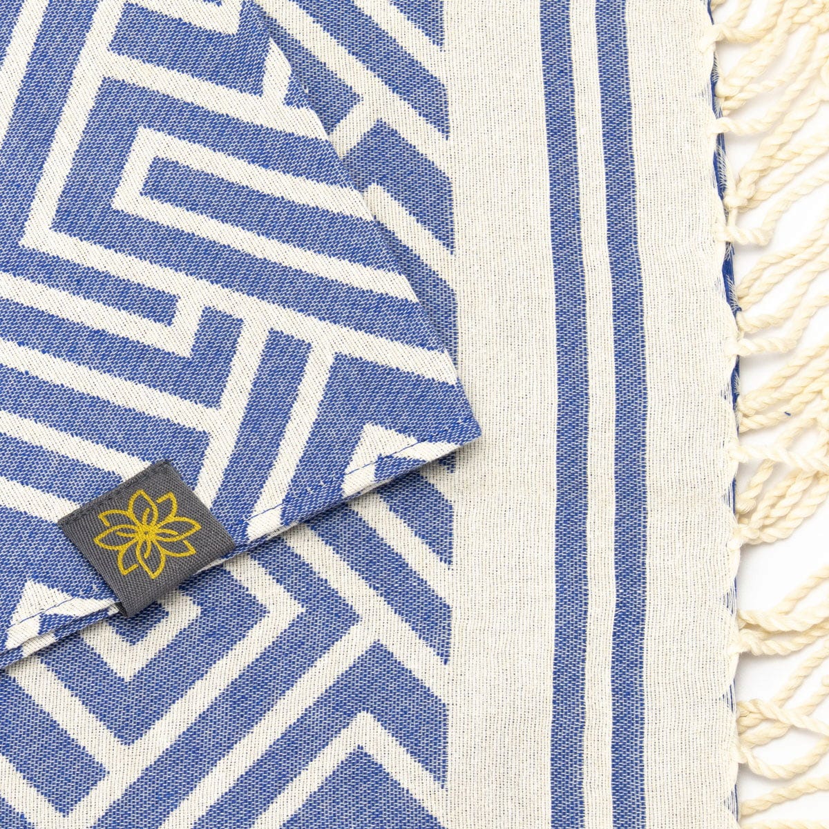 Det stilfulla labyrintmönstret ger varje exemplar en tidlös men sofistikerad estetik. Varje handduk är unik och produceras under rättvisa förhållanden, med handknutna fransar som ger en genuin, personlig prägel. Den återvunna bomullen gör detta till ett medvetet och hållbart val. I mitten av handduken finns en invävd badge med ANNA ANIQs jasminblomma, som gör att du enkelt kan hänga upp den även på små krokar - utan att den når golvet.