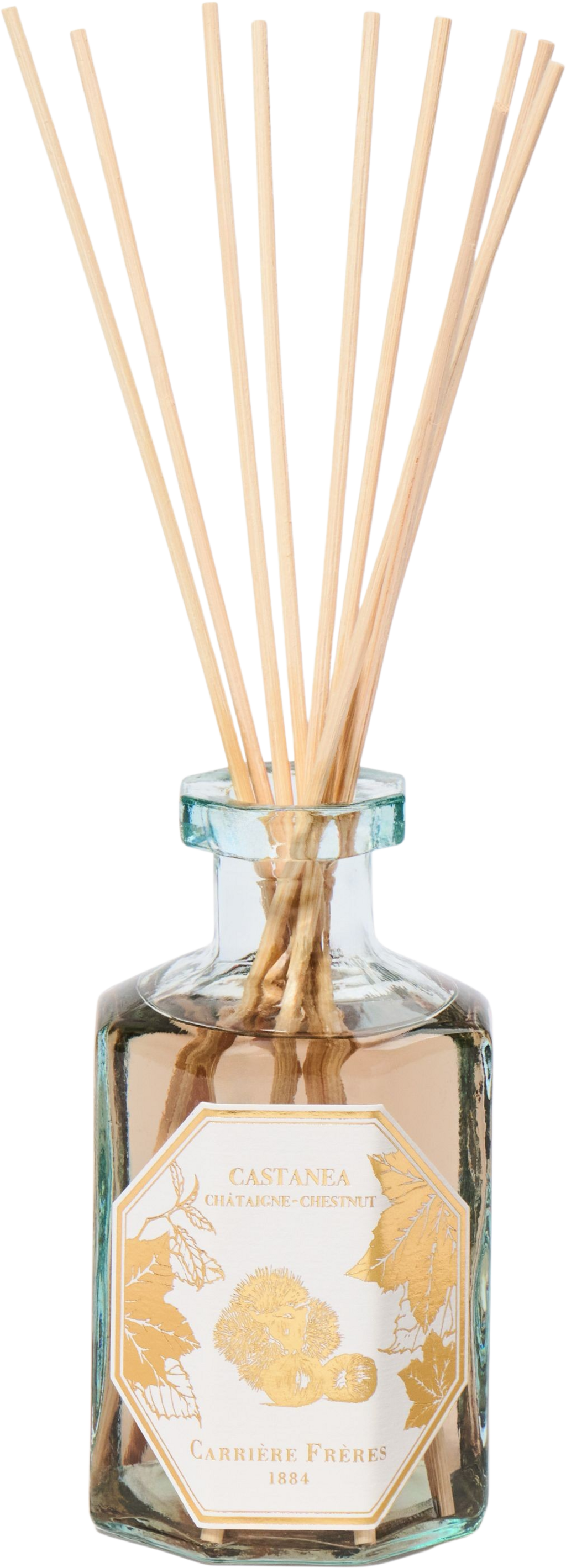 Diffuser Chestnut från Carrière Frères sprider en harmonisk och lätt sötaktig doft som skapar ett rogivande lugn. Den omslutande doften av rostade kastanjer utvecklas långsamt och elegant, medan subtila rökiga toner av cederträ och sandelträ smälter samman med sötman från torkade frukter. Den balsamiska, värmande touchen från siambenzoe rundar av doften på ett perfekt sätt.