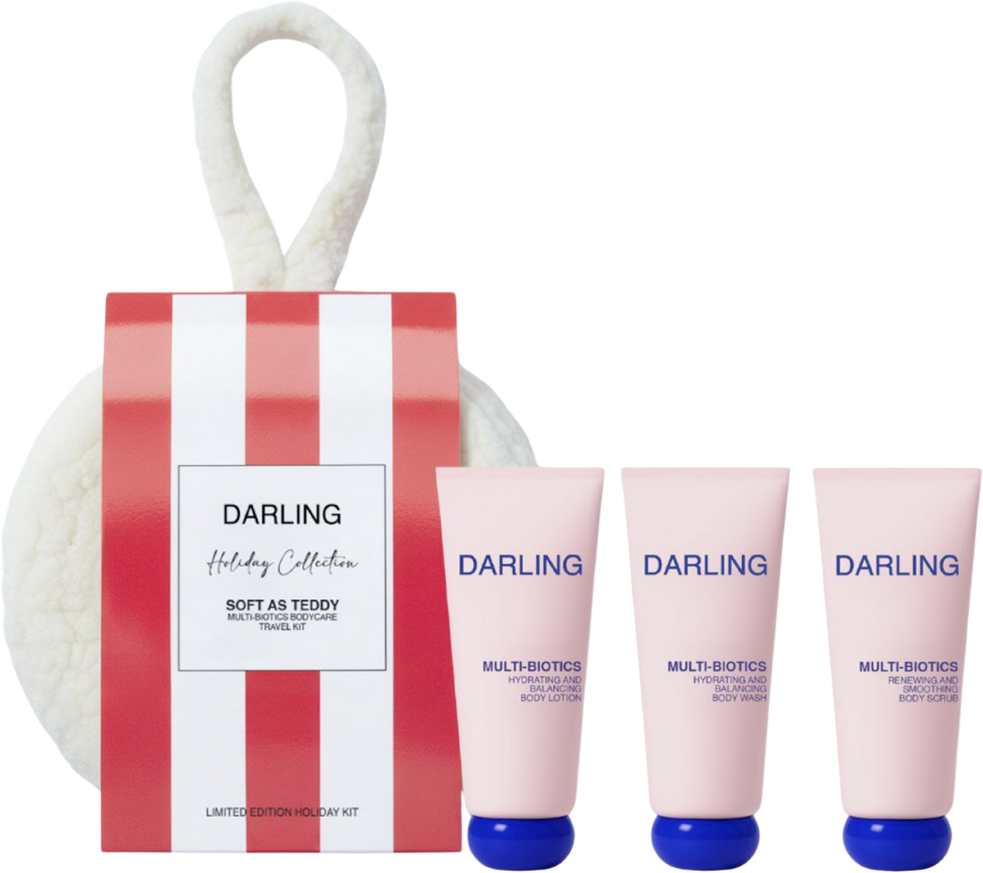 Soft as a Teddy Bodycare Travel Kit från DARLING är ett balanserat paket som ger din hud intensiv vård och som kan användas året runt. Du hittar alla produkter från Multi-Biotics-serien i en liten storlek i en vacker, fluffig kosmetikpåse: duschgel, bodylotion och skrubb. Alla produkter har en balanserande, regenererande och intensivt närande karaktär och förtrollar sinnena med en blommig, träig doft.