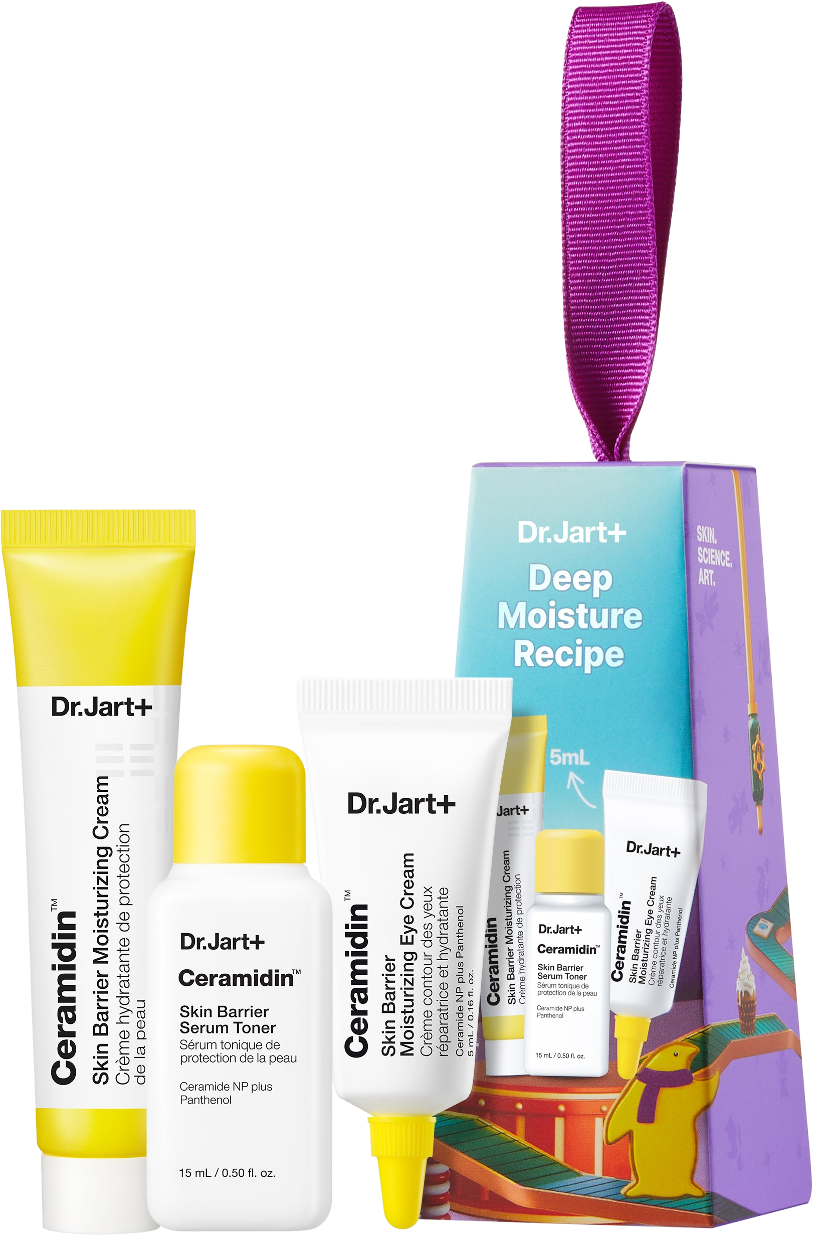 Ceramidin™ Deep Moisture Recipe Set från Dr. Jart+ ger huden omedelbar återfuktning och stärker hudbarriären för att förhindra framtida fuktförlust. Börja med det mjölkiga serum-tonern som förbereder huden med ett lätt fuktlager. Följ upp med den barriärstärkande ansiktskrämen, berikad med fem ceramider och panthenol. Avsluta med en rik, men icke-fet ögonkräm som stärker det känsliga ögonområdet och fungerar utmärkt som primer under makeup.