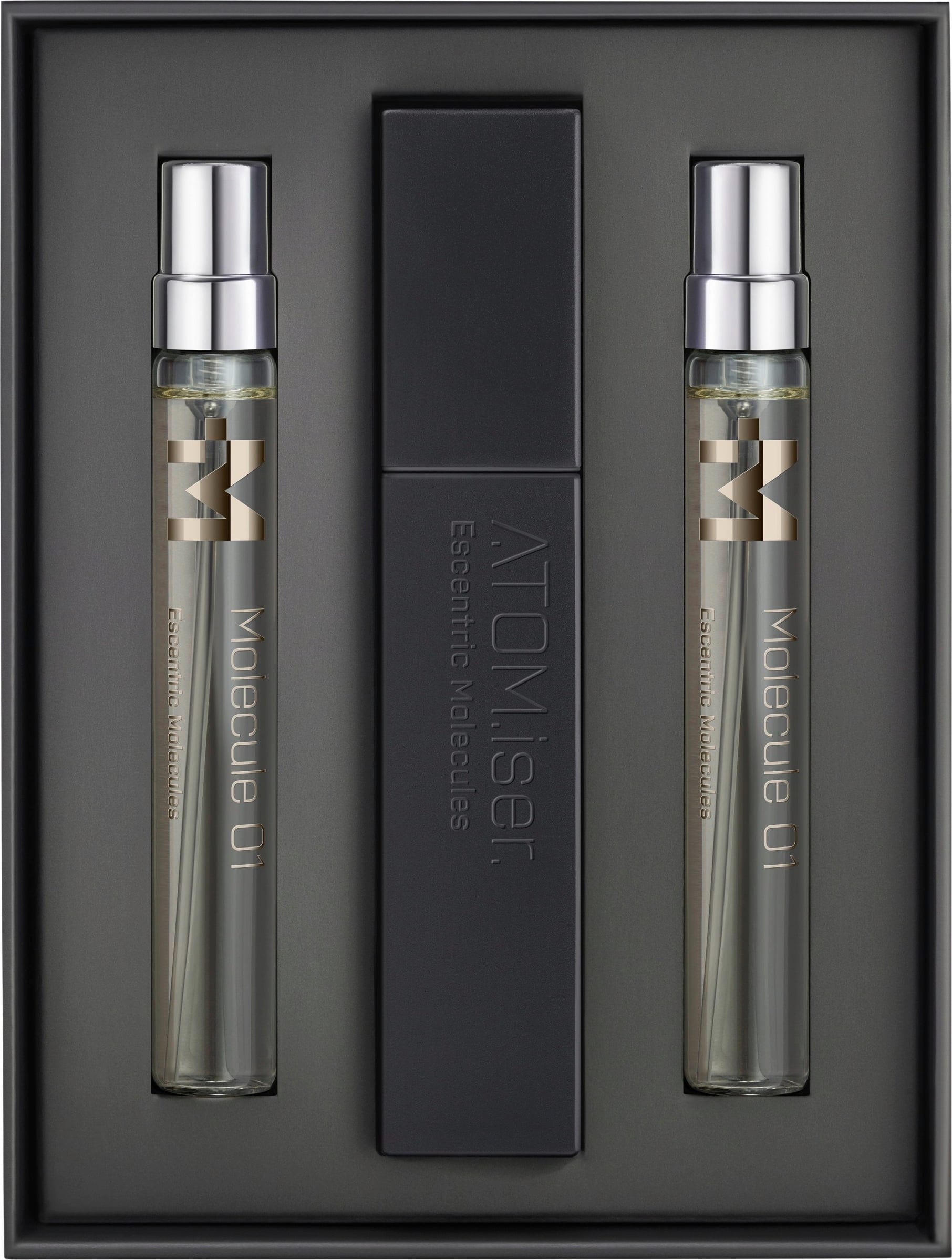 Molecule 01 ATOM.iser Set från Escentric Molecules är ett lyxigt set som består av tre Molecule 01 eau de toilette i reseformat och ett smidigt doftetui, utvecklat för hållbarhet och en exklusiv reseupplevelse som kompletterar din livsstil på språng.