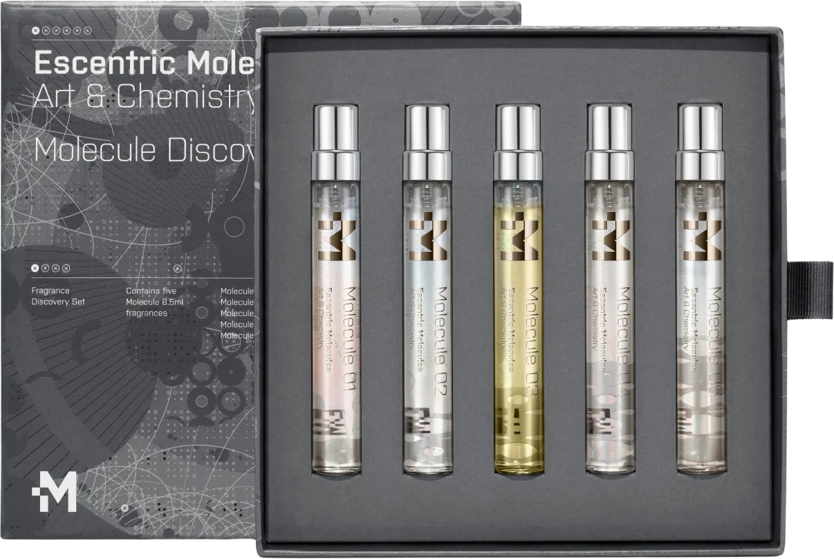 Molecule Discovery Set från Escentric Molecules bjuder in dig att utforska en ny syn på parfym där minimalism står i fokus. I detta set får du alla fem ikoniska Molecule-dofter i praktiska 8,5 ml-flaskor som passar perfekt i vardagen. Varje doft lyfter fram en enskild ingrediens som vanligtvis ligger i bakgrunden, men som här får ta plats och visa sin fulla karaktär.