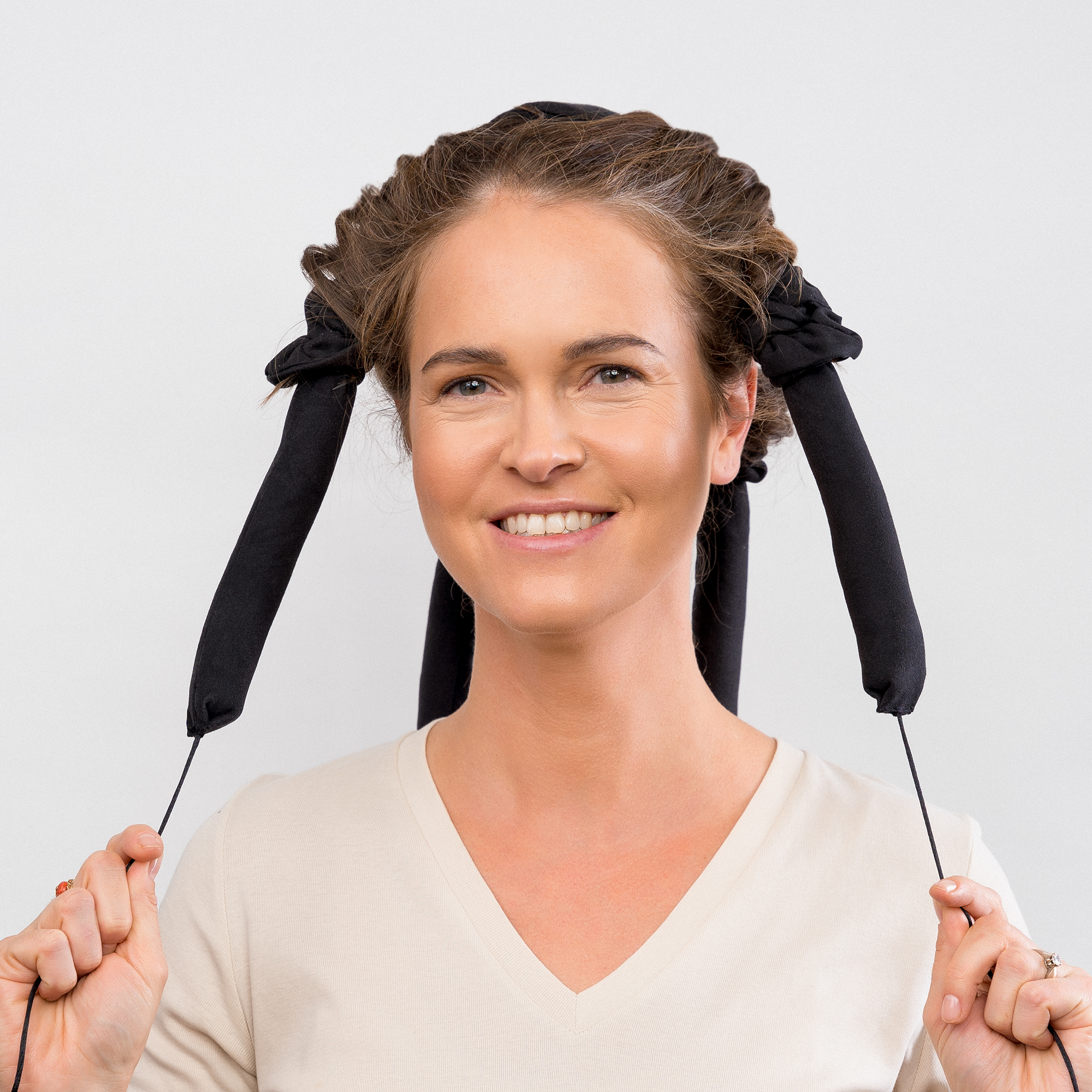 - Säkra ändarna med de bifogade hårbanden och knyt ihop dem i nacken.