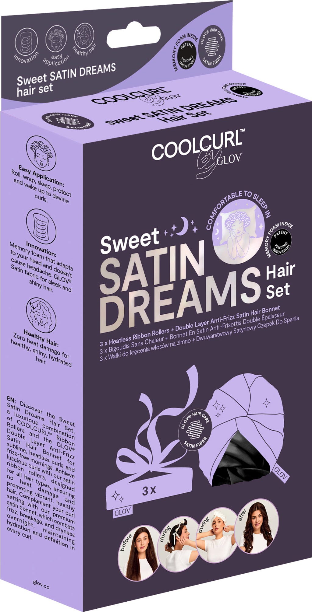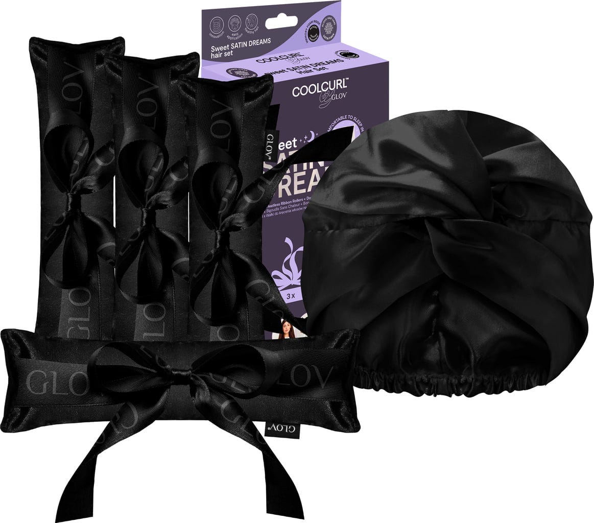 Upptäck Sweet Dreams Satin Set - en lyxig kombination av COOLCURL™ Ribbon Rollers och Double Layer Anti-Frizz Satin Hair Bonnet. Tillsammans lovar de värmefria lockar och frizzfria morgnar. De är designade för alla hårtyper och är särskilt skonsamma mot håret. Satinturban skyddar håret från hårbrott, fuktavfall och krusning och bibehåller lockarnas definition.