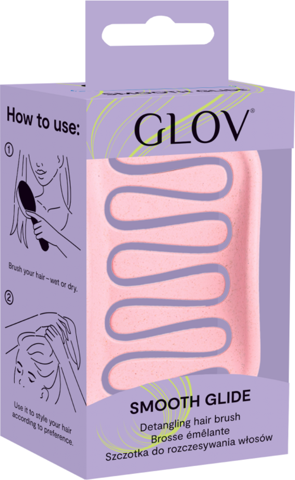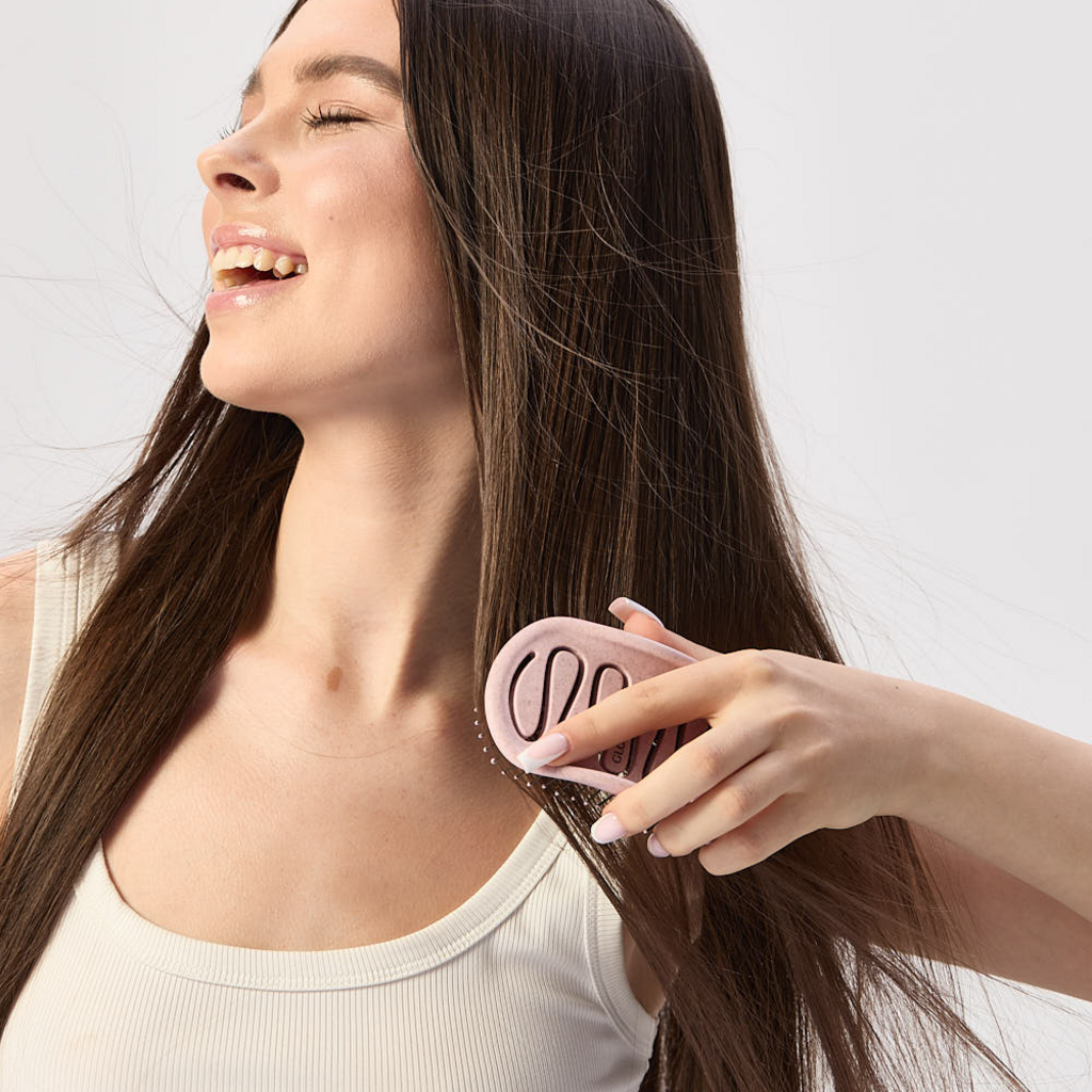 Smooth Glide Detangling Hair Brush från GLOV reder ut håret snabbt, smidigt och utan smärta. Den handhållna borsten är tillverkad av biobaserat vetestrå och har flexibla borst i olika längder som glider mjukt genom håret utan att skada hårstråna eller skapa statisk elektricitet. Den ergonomiska, vadderade formen minskar trycket vid utredning – perfekt för alla hårtyper, från tunt och tjockt till lockigt eller känsligt barnhår.