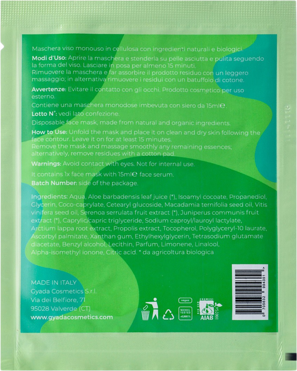 Denna produkt är märkt vegan på förpackningen, även om den innehåller propolis. Hur är detta möjligt? Denna ingrediens är ett vegetabiliskt harts som produceras av bin från träd och olika växter, men produceras inte direkt från dem. Beroende på om det producerad växt eller djur, kan det hända att propolis en gång klassificeras som vegan och en annan gång som icke-vegan. GYADA, tillsammans med produktionslabbet, har märkt denna mask som vegan, eftersom båda antar att propolis inte kan definieras som en produkt av animaliskt ursprung.