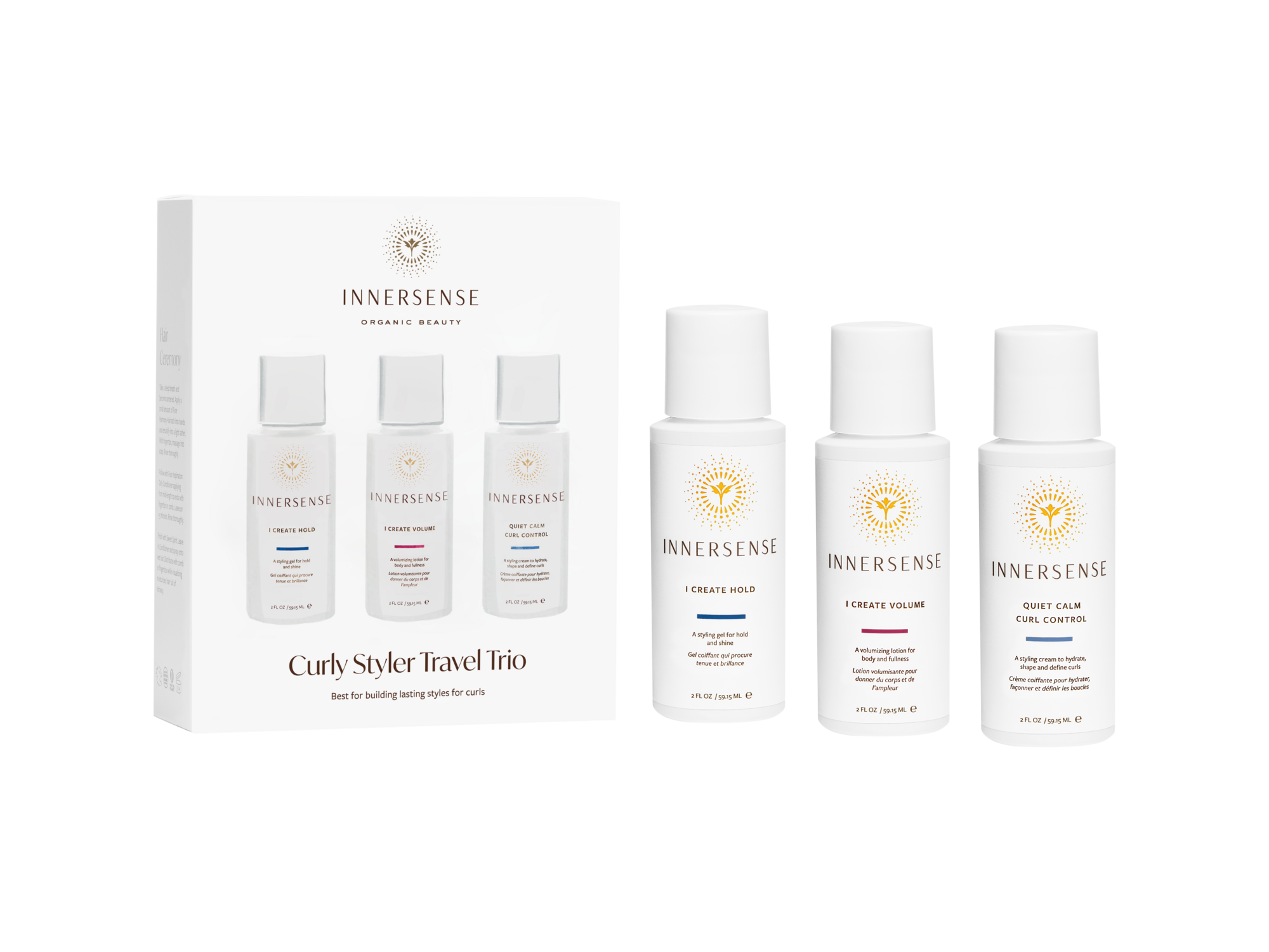 Curly Styler Travel Trio från Innersense Organic Beauty ger dina lockar perfekt stadga även på resan. Stylinggelen I Create Hold med aloe och honung definierar lockar, släta knutar och strukturerade frisyrer, medan stylinglotionen I Create Volume ger medelhård stadga och fyllighet för en voluminös look. Stylingkrämen Quiet Calm Curl Control slätar ut och definierar håret samt ger lockarna glans tack vare sin vårdande effekt.