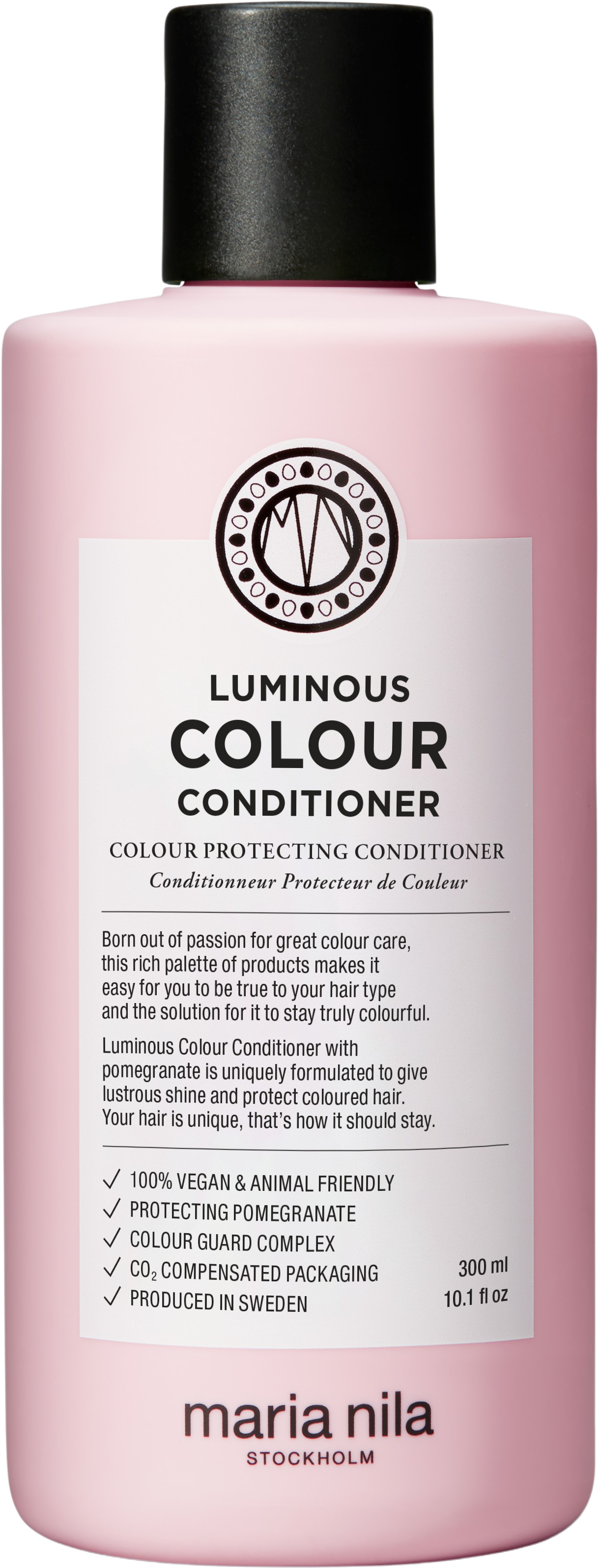 Vill du att ditt färgade hår både ska stråla och kännas silkeslent? Luminous Colour Conditioner från Maria Nila är den perfekta lösningen. Den återfuktande balsamet förlänger färgens intensitet samtidigt som det gör håret mjukt och lätt att reda ut. Du slipper dessutom friss och statisk elektricitet tack vare den utjämnande effekten. Kombinationen av granatäppleextrakt och en kraftfull Colour Guard Complex skyddar hårfärgen mot både tvätt och värmestyling. Samtidigt stärker balsamet hårstråna och motverkar färgförlust. Resultatet? En strålande, långvarig färg med wow-effekt!