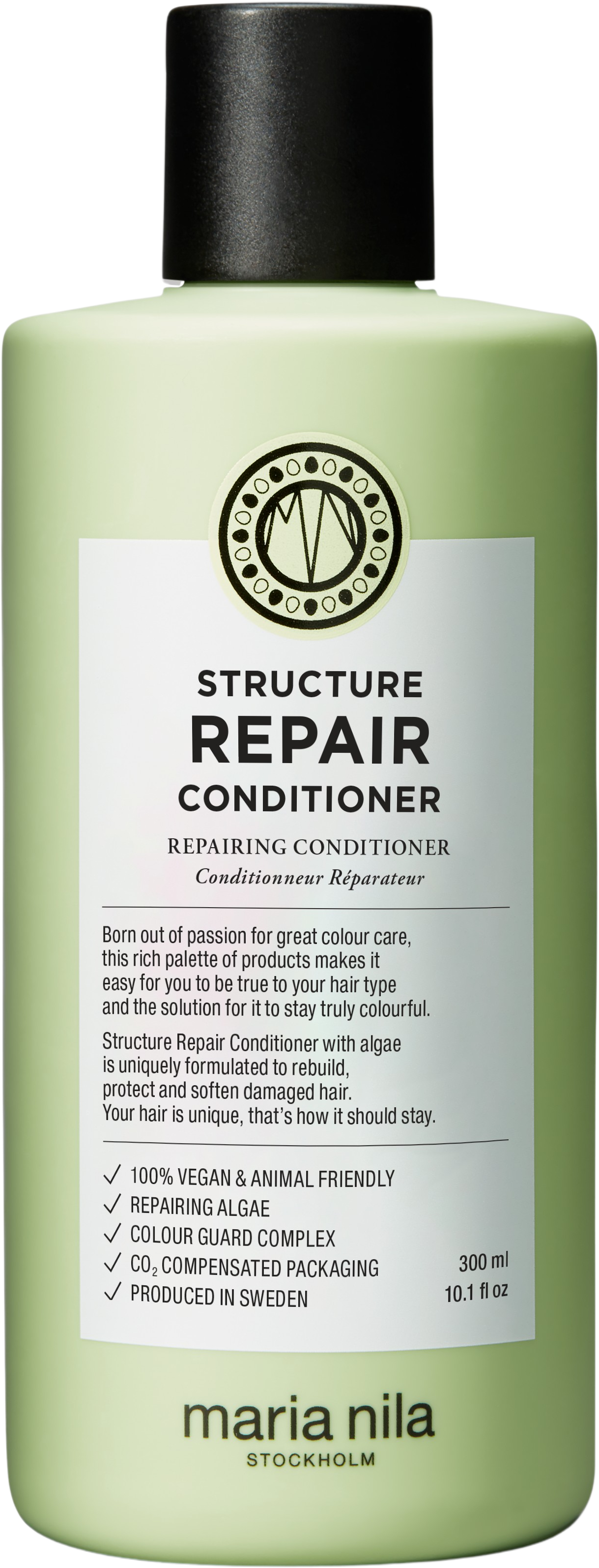Structure Repair Conditioner från Maria Nila är ett utredande balsam för skadat, torrt och kemiskt behandlat hår som återfuktar, gör håret smidigt och motverkar statisk elektricitet. Den reparerande algextrakten stärker håret, tillför glans och smidighet. Dessutom skyddar balsamet håret mot UV-strålning, vilket hjälper till att bevara färgen längre.