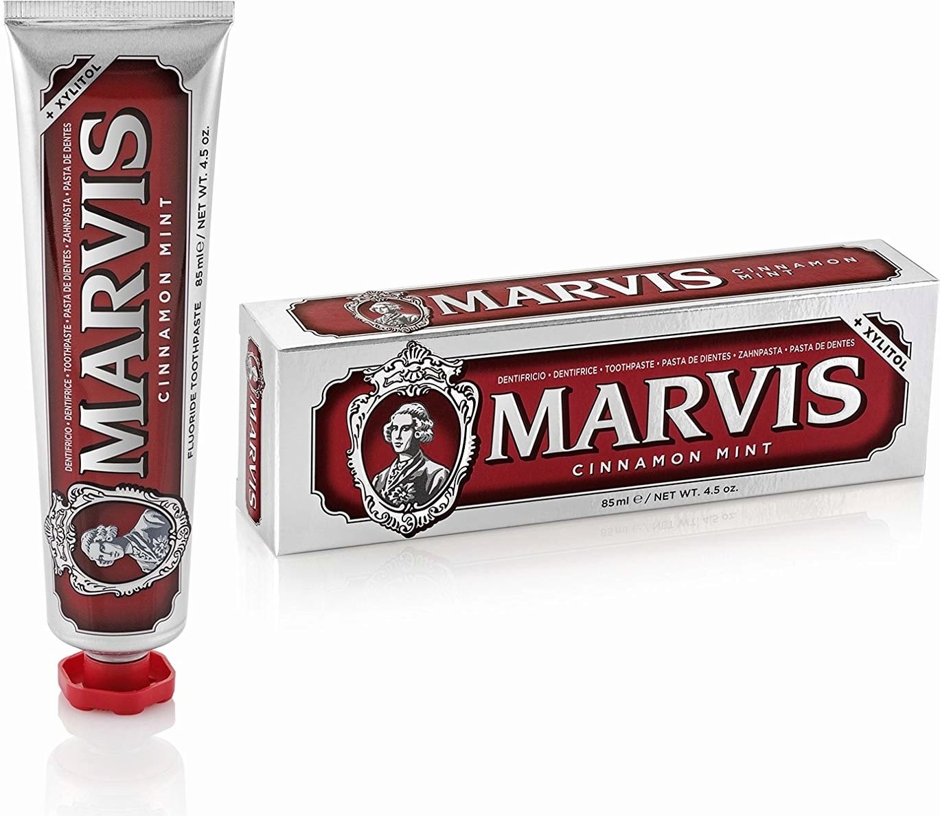 Tandkrämen från Marvis med smak av kanel och frisk pepparmynta ger en skonsam tandblekning utan att slita på emaljen. Missfärgningar från till exempel kaffe eller te jämnas effektivt ut.