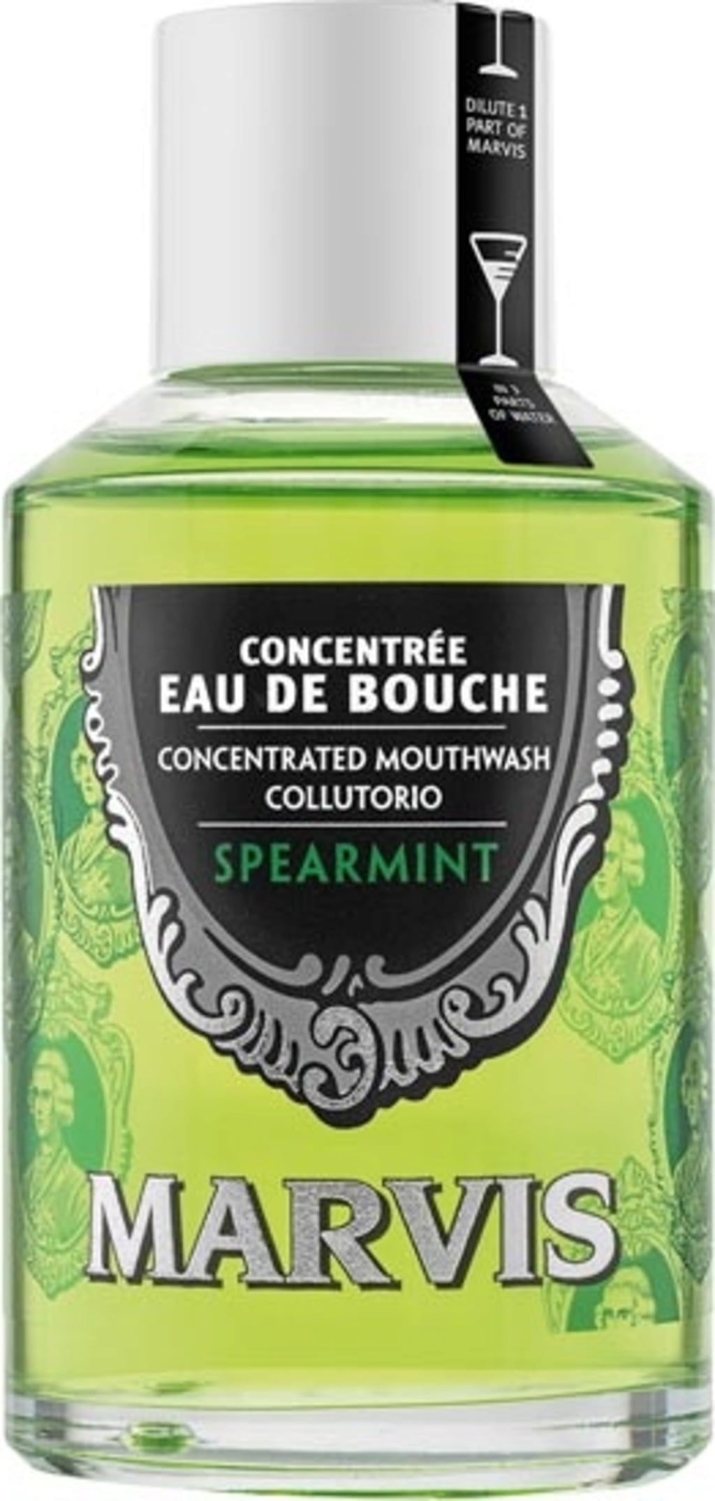 Mouthwash Spearmint från Marvis ger omedelbart fräsch andedräkt och lämnar en ren mintkänsla i munnen.