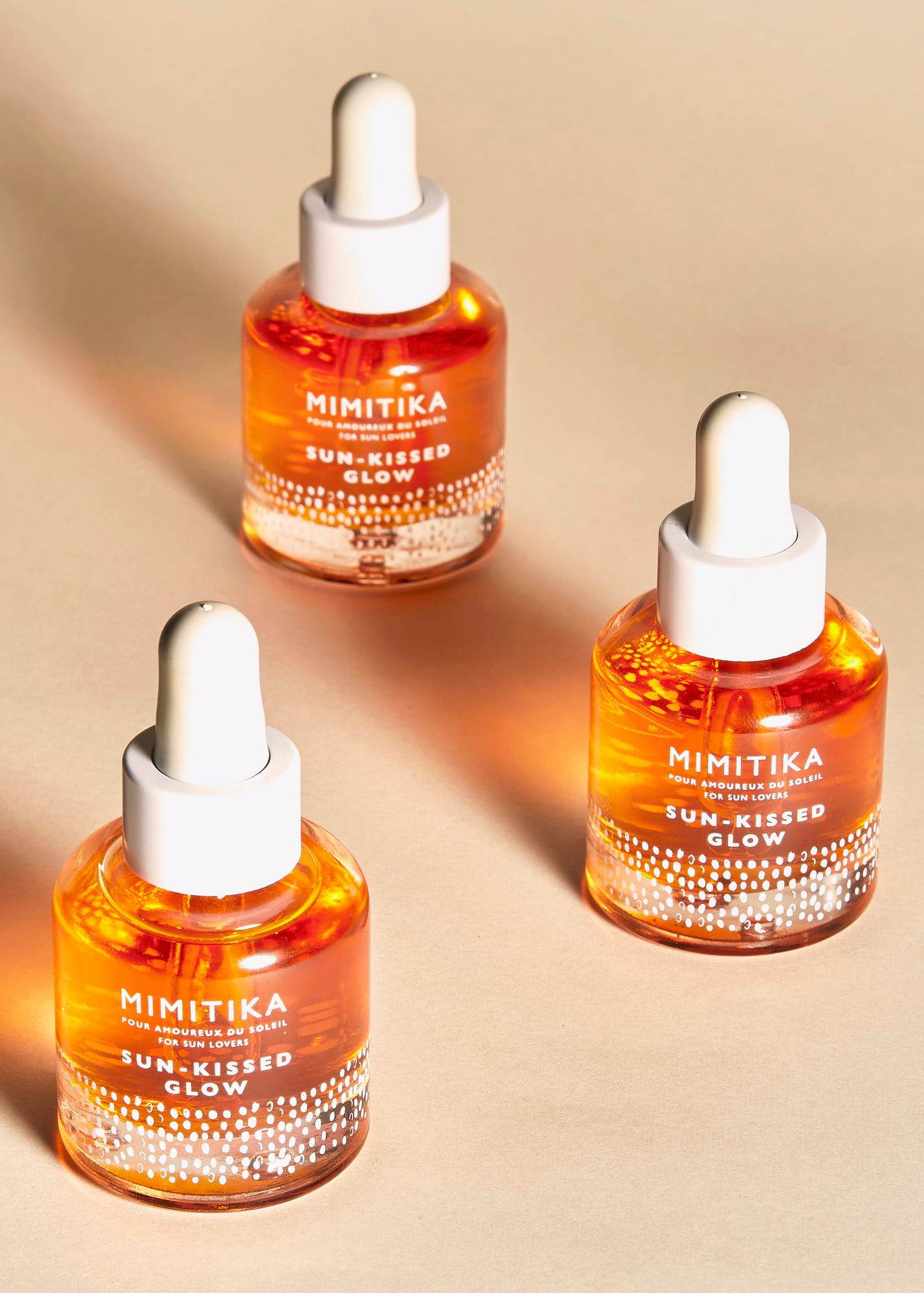 Serum Sun-Kissed Glow från Mimitika ger huden en omedelbar gyllene ton med naturlig lyster. Formulan är rik på växtoljor med högt betakarotininnehåll som jämnar ut hudtonen utan att kännas fet. Hallonfröolja fungerar som ett skyddande lager mot yttre påverkan.