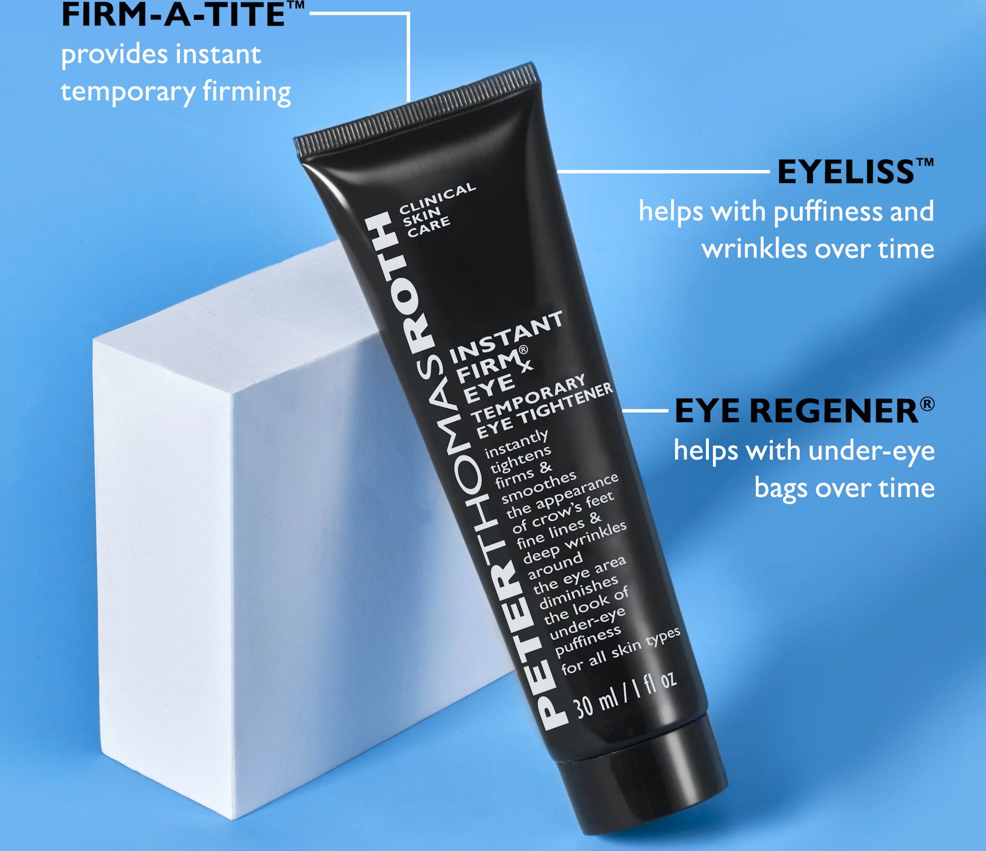 Instant FirmX™ Eye från Peter Thomas Roth reducerar synligheten av kråksparkar, fina linjer, djupa rynkor och svullnader under ögonen - direkt efter applicering.