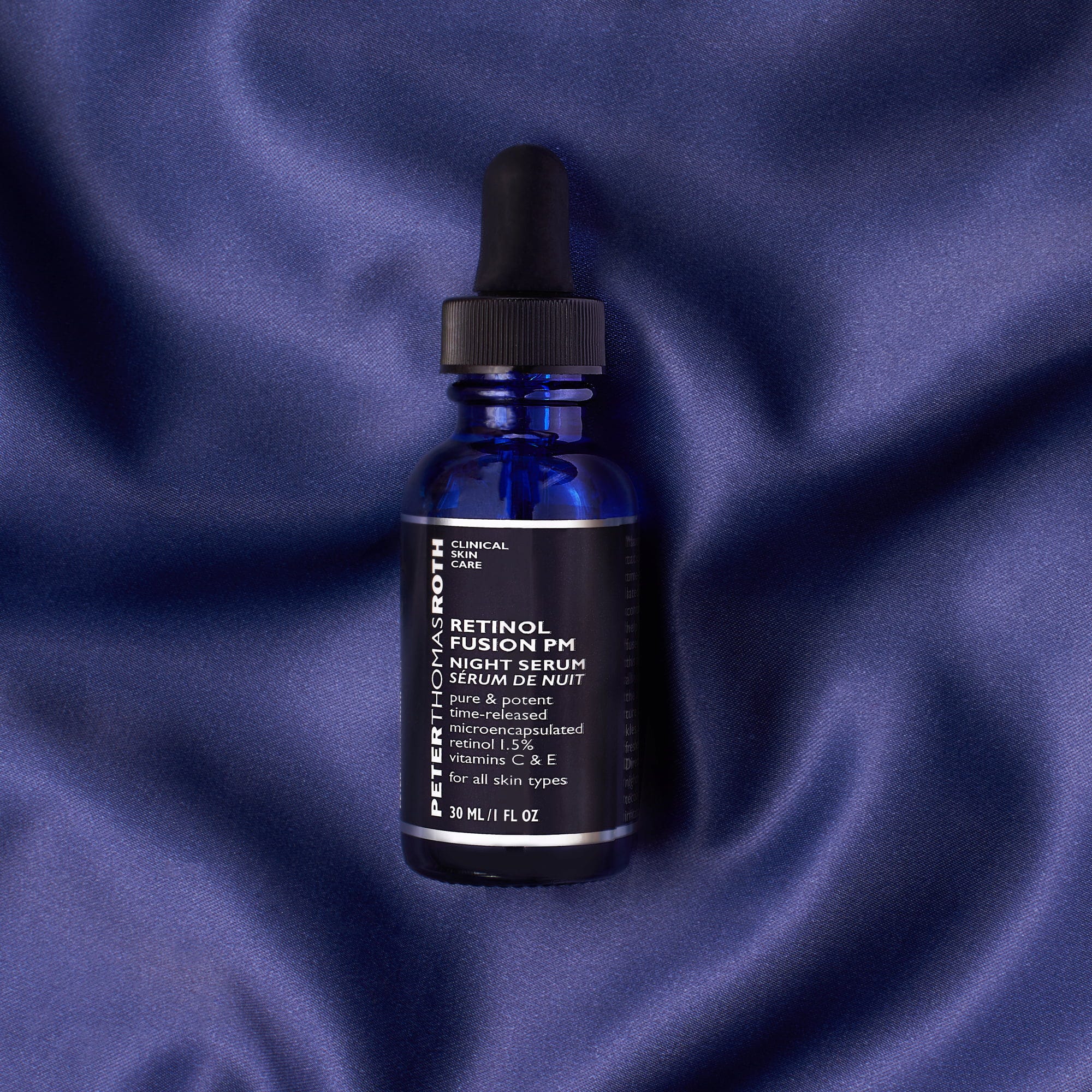 Retinol Fusion PM Night Serum från Peter Thomas Roth innehåller 1,5 % mikroinkapslat retinol som frigörs gradvis under natten för en skonsam men effektiv exfoliering av huden.