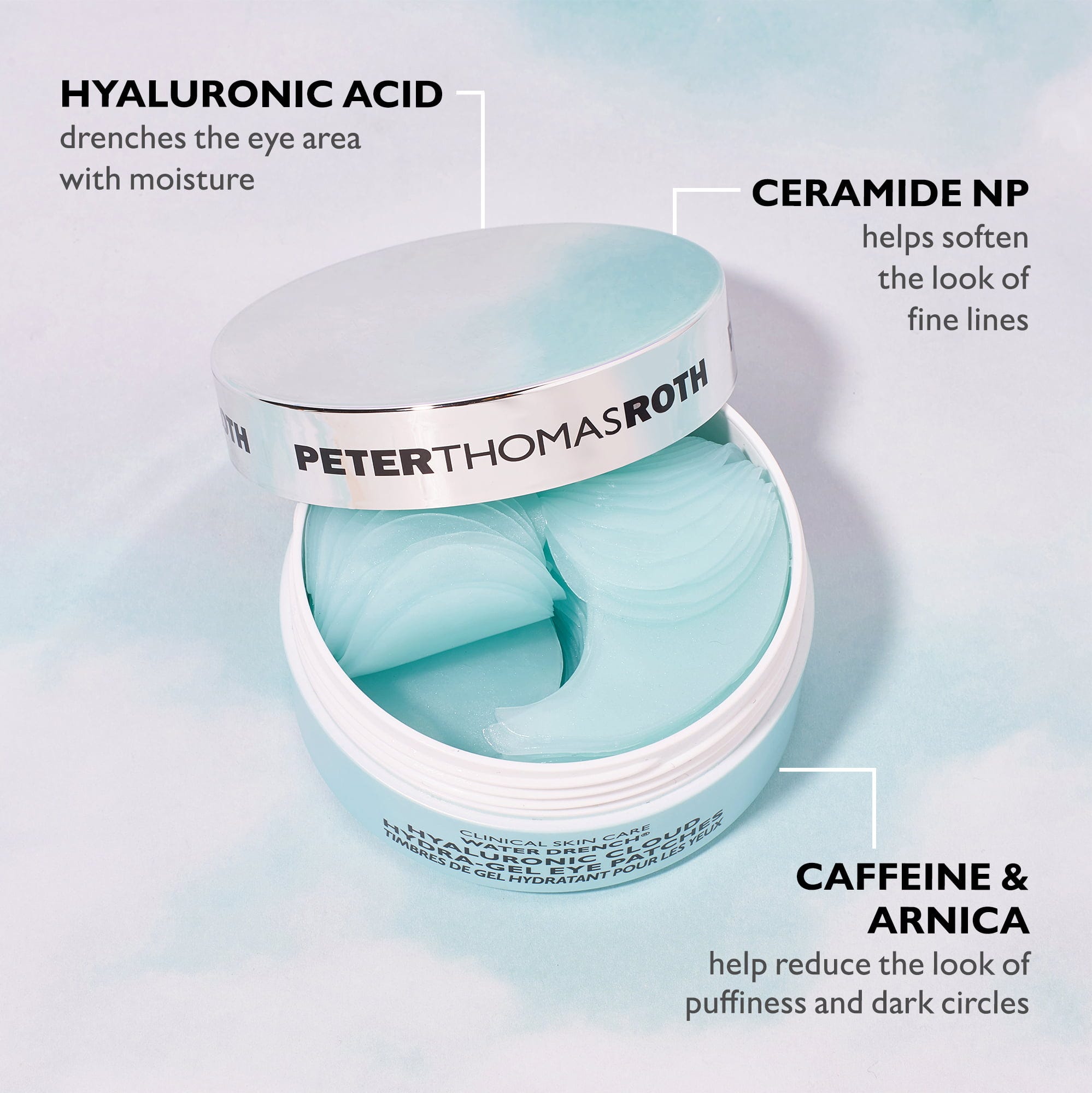 Patchesen innehåller både lång- och kortkedjiga hyaluronsyror som återfuktar på djupet och binder upp till 1000 gånger sin egen vikt i fukt. Ceramid NP, kollagen och extrakt från läkemalva mjukar upp fina linjer, medan koffein ger en uppiggande effekt. Arnika bidrar till att reducera mörka skuggor under ögonen.