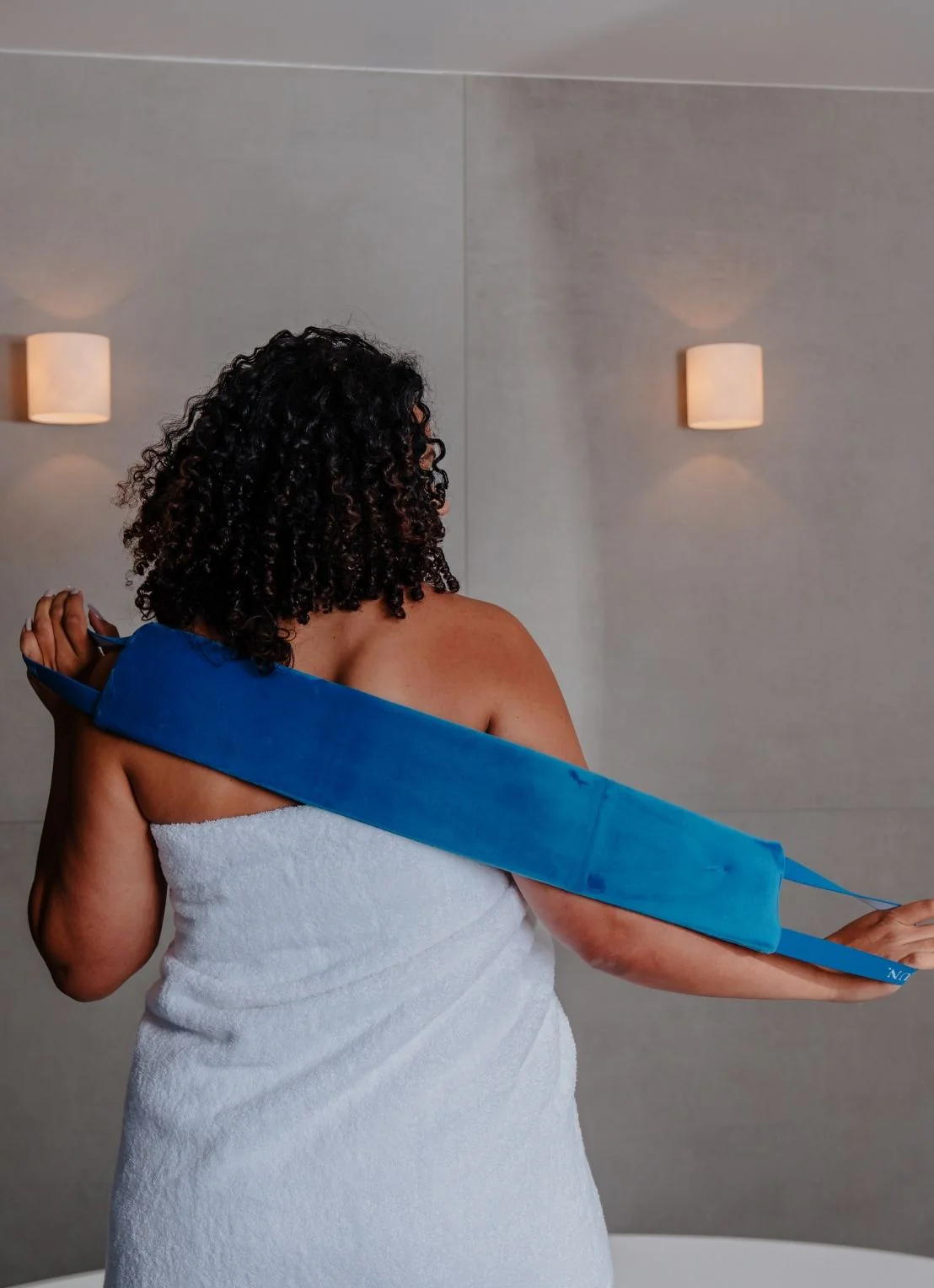 - Ta tag i handtagen – ett i varje hand – och dra applikatorn fram och tillbaka över ryggen för att täcka även de mest svåråtkomliga partierna jämnt.