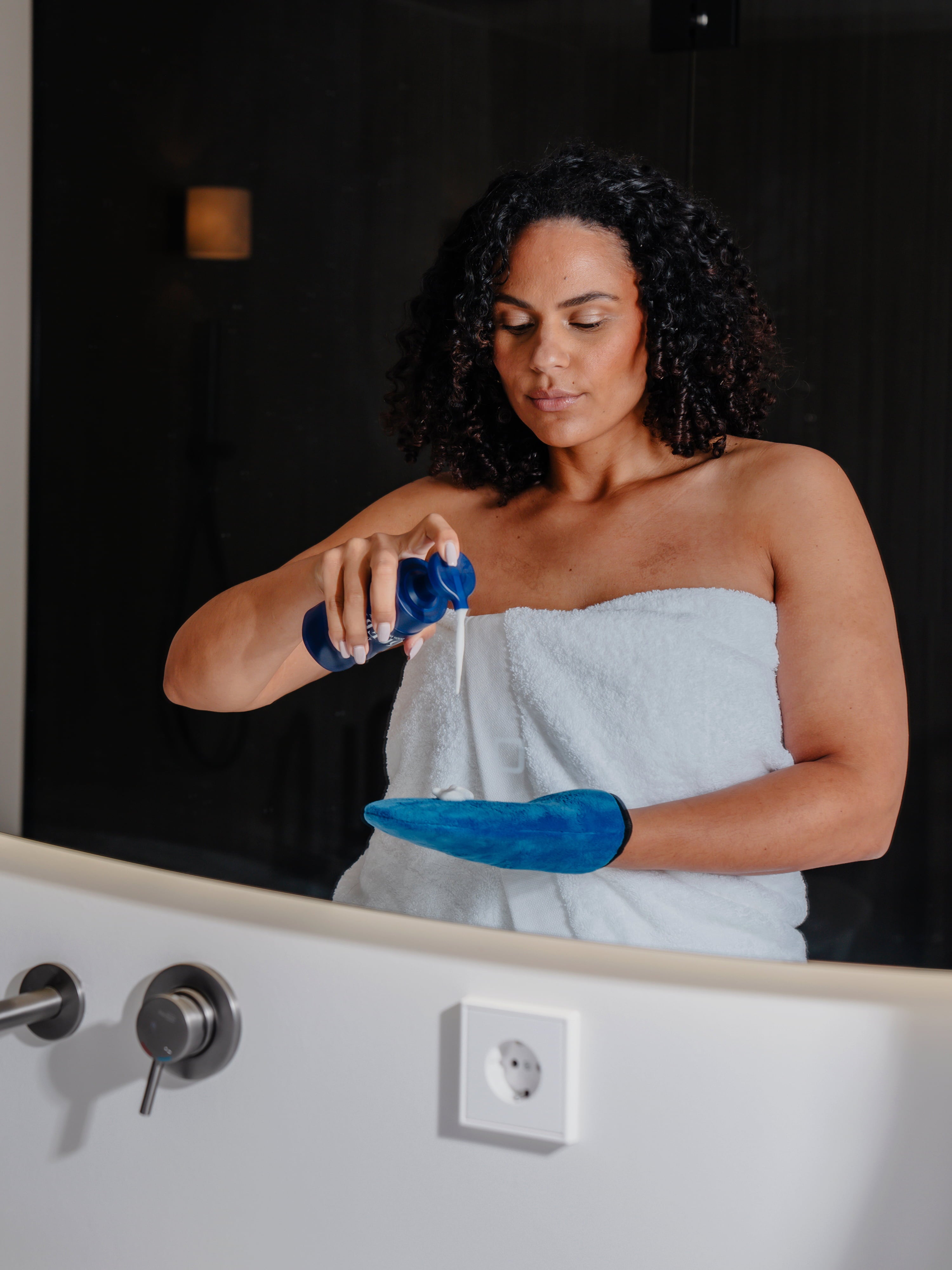 - Applicera en generös mängd mousse på din bräuningshandske. Den supermjuka Tanning Glove från ROQUEBRUN är perfekt för detta.