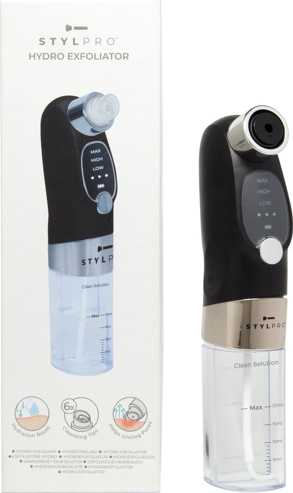 Den innovativa Hydro Exfoliator från StylPro hjälper dig att rengöra och vårda din hud på djupet. Med hjälp av vakuumteknik rengör den porerna samtidigt som huden behandlas med valfri vätska. Du kan välja mellan 6 olika rengöringshuvuden och 3 intensitetsnivåer för att anpassa behandlingen efter dina behov.