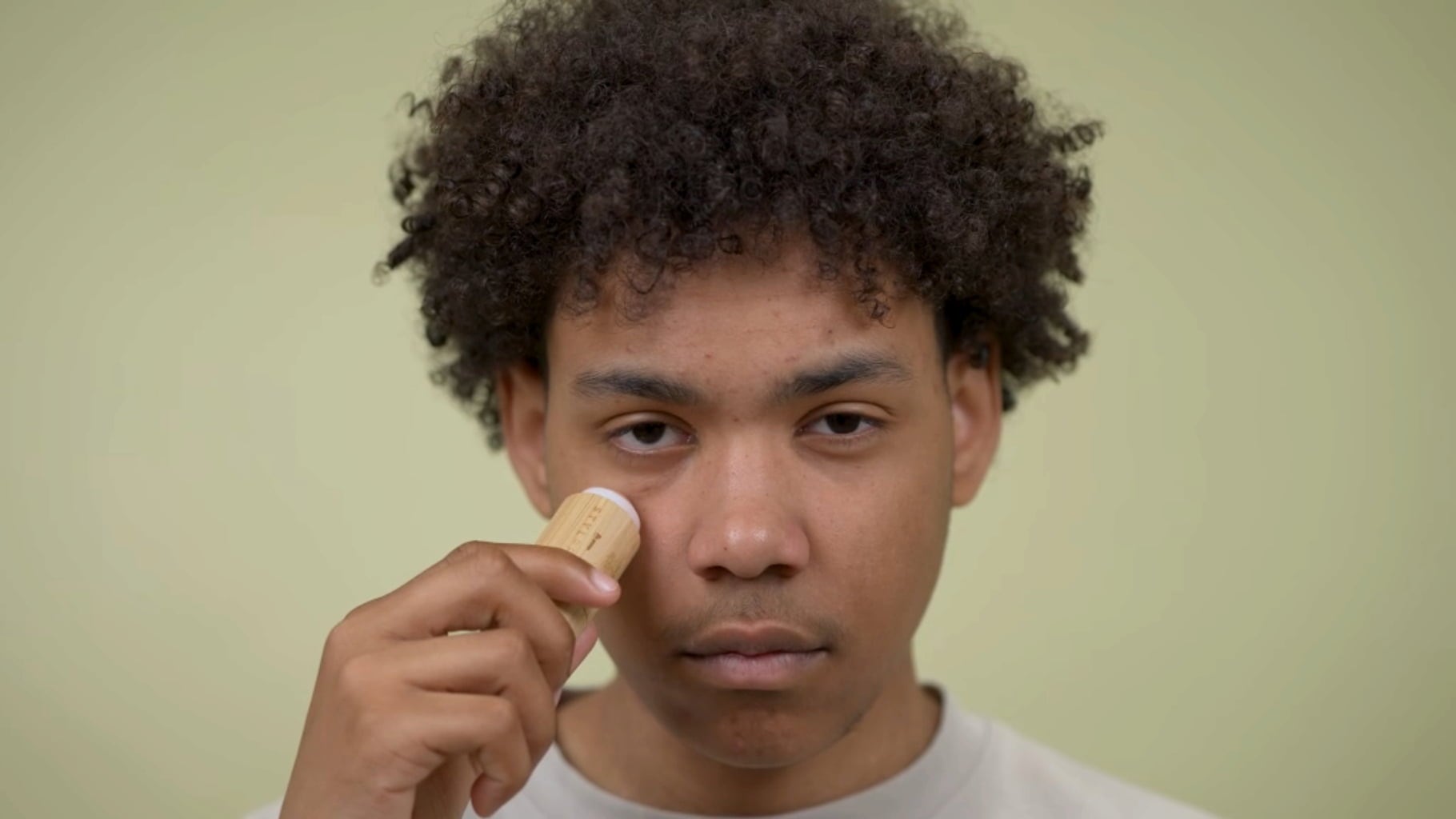 Användning: Ta bort locket från ena änden och rulla försiktigt över panna, T-zon eller andra områden där du vill minska glans.