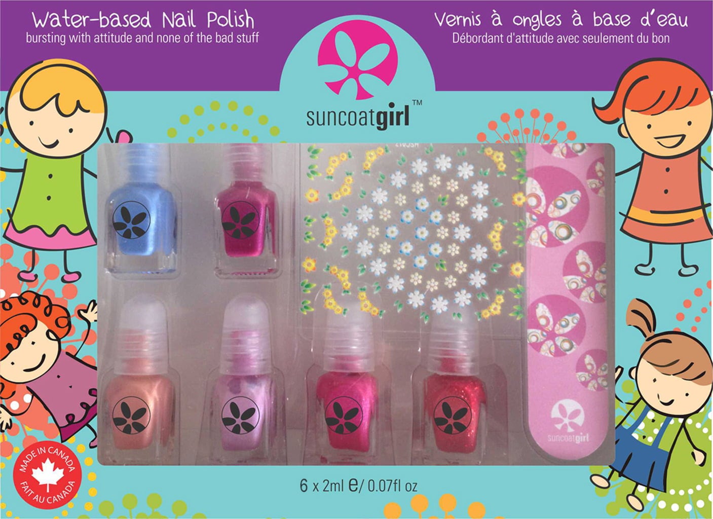 Mini mani set innehåller de sex mest populära nagellacksfärgerna från Suncoatgirl, inklusive fil och ett blad av coola nagelstickers! Perfekt att ge bort eller helt enkelt för mysiga föräldrar-och-barn beauty eftermiddagar!