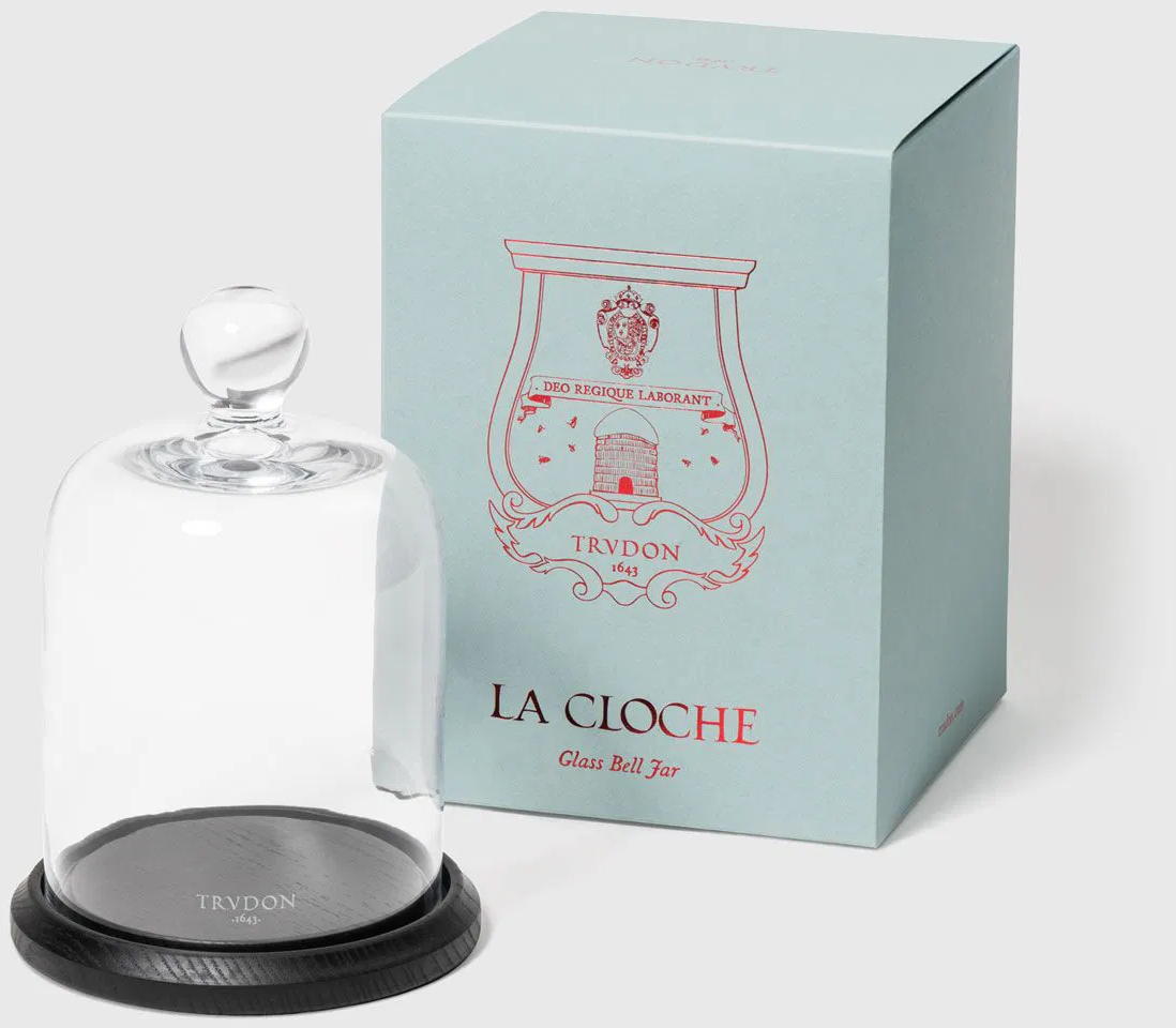 La Cloche från Trudon består av en munblåst glaskupa, vackert dekorerad med Trudons gyllene logotyp. Tillsammans med det polerade träfatet bildar kupan ett elegant set. Detta lyxiga föremål har en lång tradition hos Trudon – det skyddar ljuset och koncentrerar dess doft, så att älskare av vackra dofter kan uppleva sina ljus fullt ut i hemmets miljö.