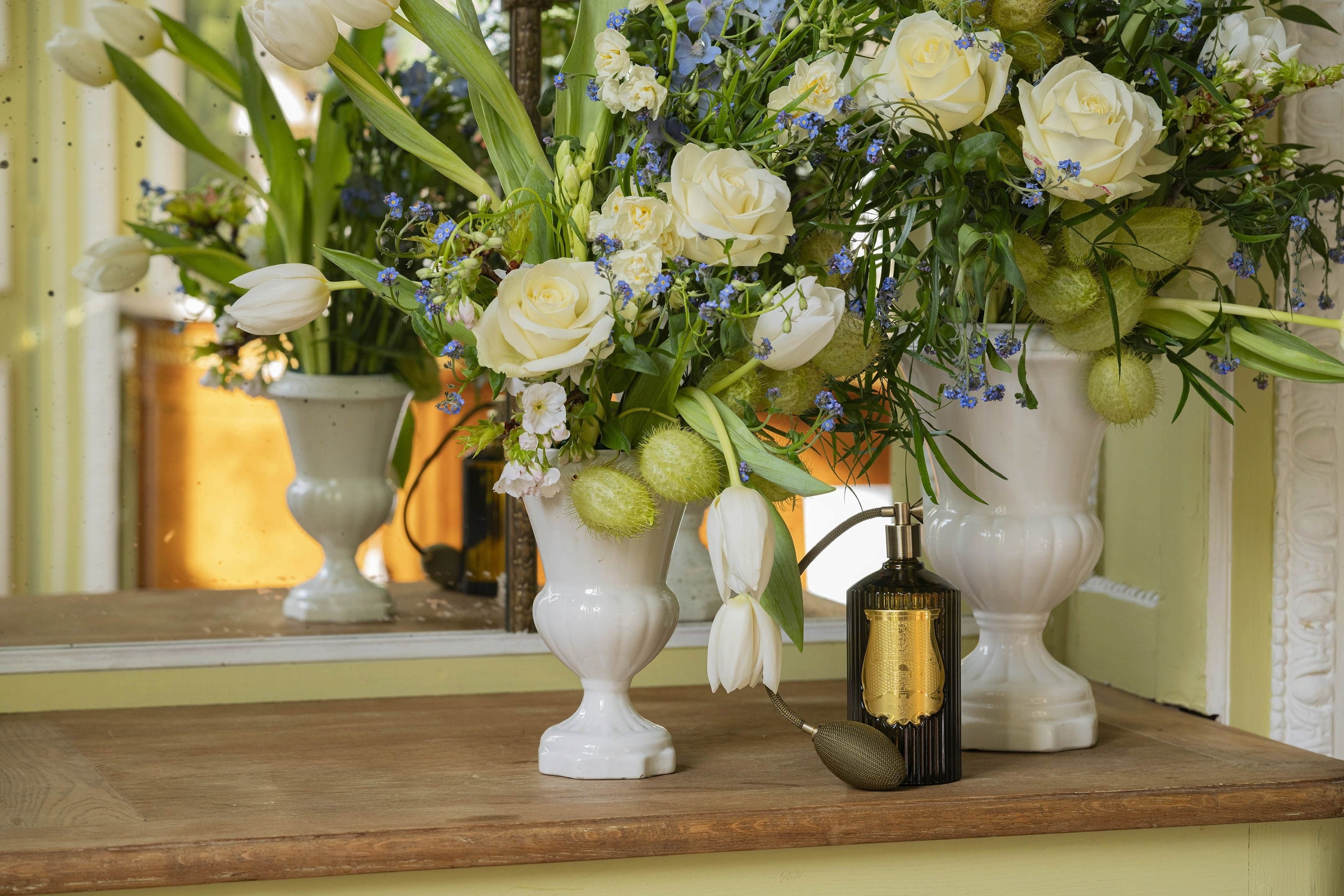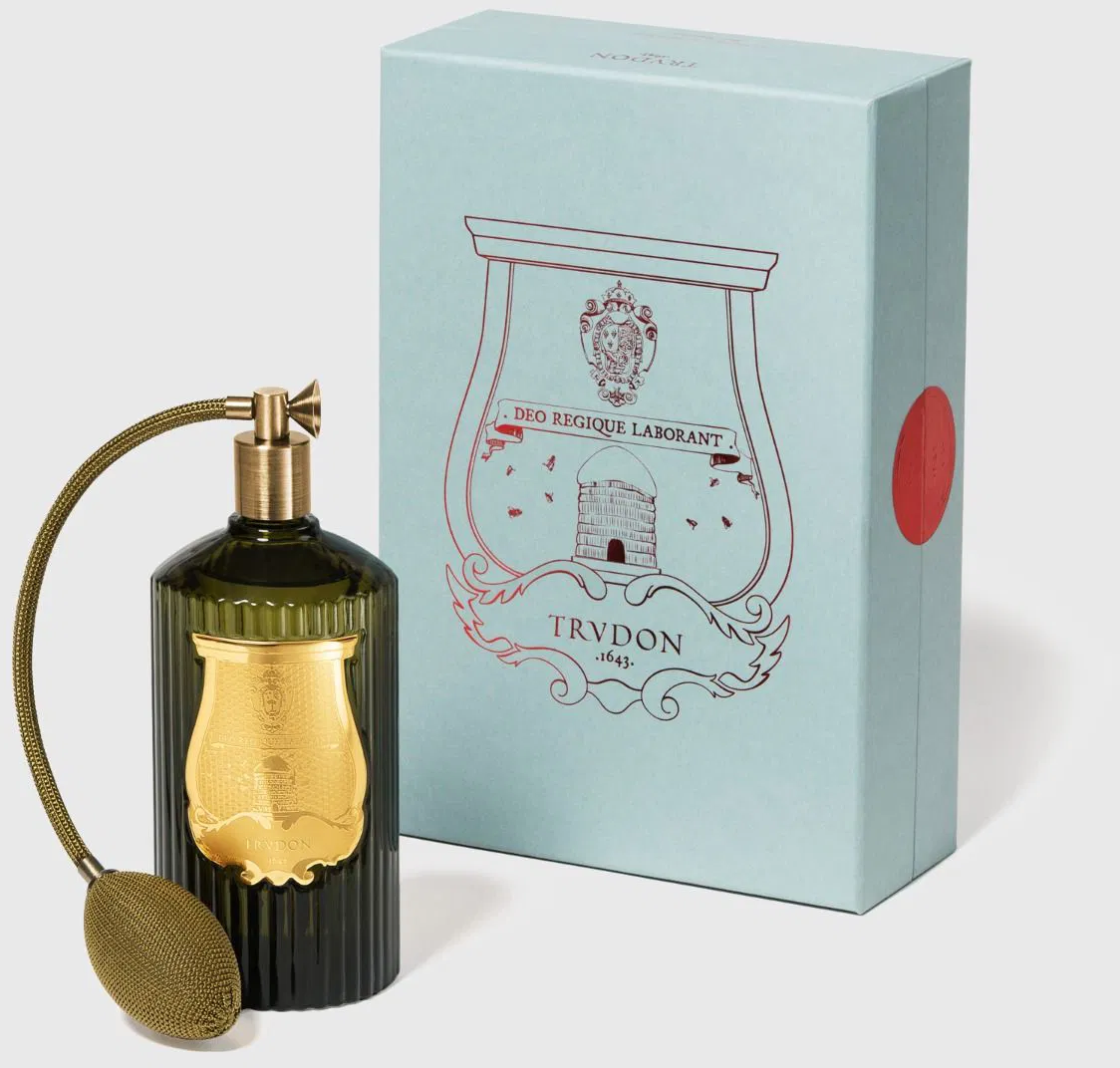 Room Spray Abd El Kader från Trudon är handgjord i Toskana i ikoniskt grönt glas, prydd med ett gyllene emblem och en klassisk tofs. Doften sprider sig omedelbart i rummet och kan även användas på textilier som gardiner, mattor eller överkast för att skapa en långvarig, väldoftande atmosfär.