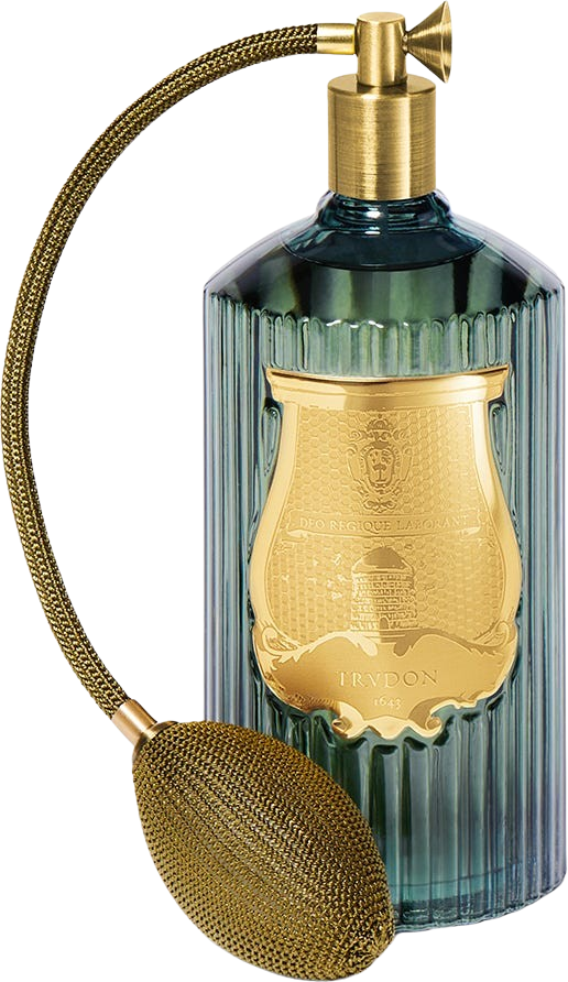 Room Spray Figuerie från Trudon är handtillverkad i Toscana i ikoniskt grönt glas, dekorerad med ett gyllene emblem och försedd med en traditionell tofs. Sprayen skapar direkt en behaglig doft i ditt hem och kan användas både i luften och på textilier som gardiner, mattor och överkast.