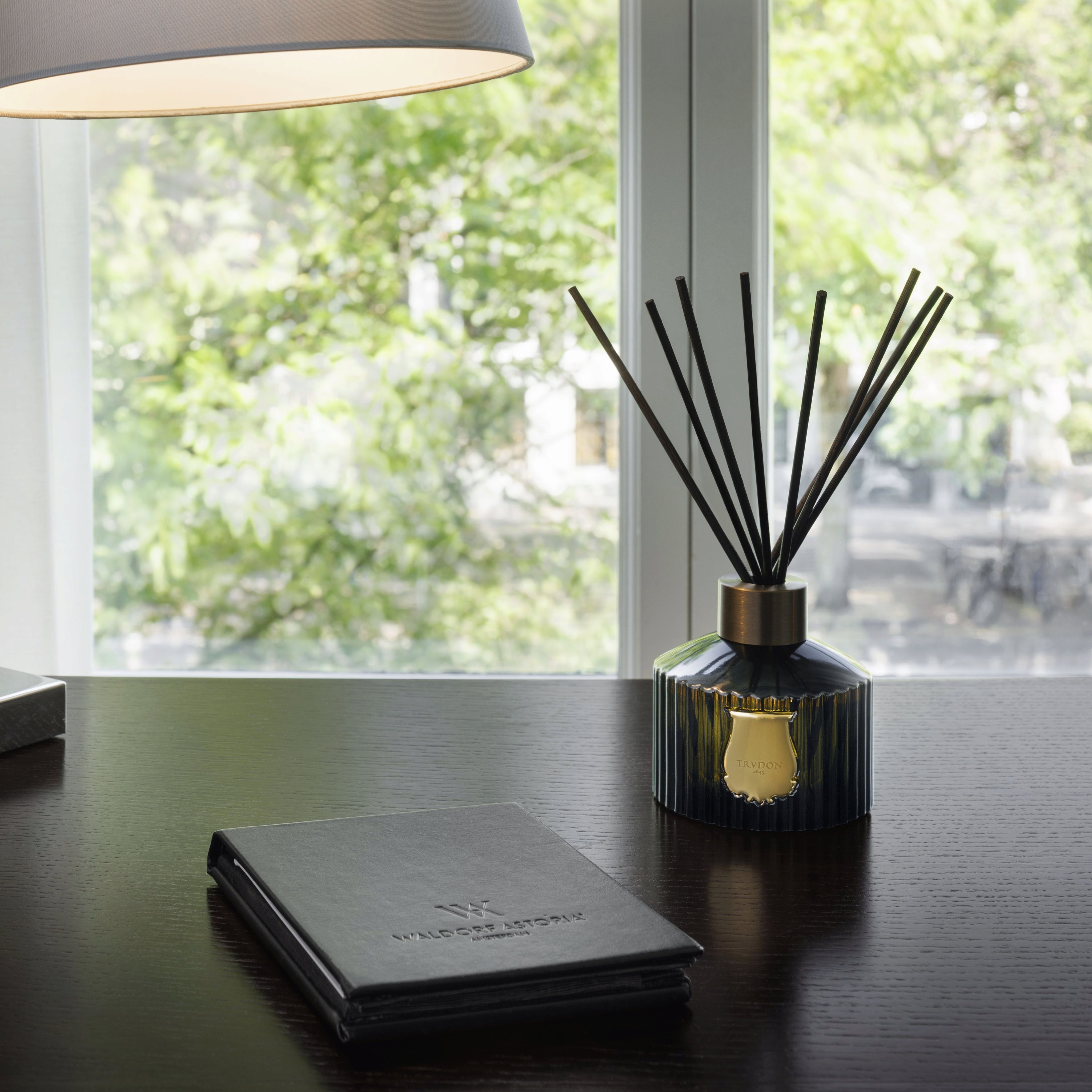 The Diffuser Ernesto från Trudon är handgjord i Frankrike av ikoniskt grönt glas, dekorerad med ett gyllene emblem och avslutad med en elegant aluminiumring. Åtta svarta rottingpinnar sprider doften jämnt i rummet och skapar en varm, sofistikerad atmosfär.