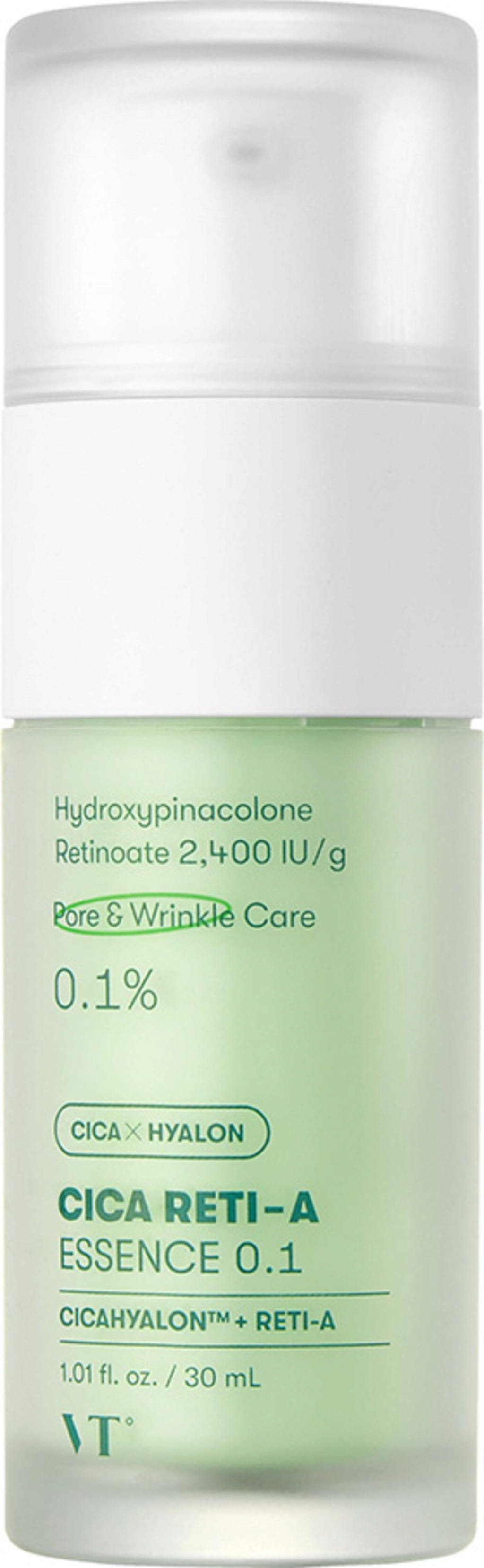 Cica-Reti-A Essence 0.1 från VT Cosmetics hjälper dig att få en jämnare och klarare hud. Med 0,1 % hydroxypinacolon retinoat arbetar essensen effektivt mot fina linjer och trött hud samtidigt som cellförnyelsen stimuleras. Formulan ger resultat utan att kännas för intensiv. Tack vare cicahyalon-komplexet återfuktas och lugnas huden på samma gång. Bakuchiol och niacinamid bidrar till att förfina porerna och förbättra hudens lyster. Ceramider och propolis stärker hudbarriären och ger en mjuk känsla. Den lätta texturen absorberas snabbt och arbetar under natten för ett fräschare resultat.